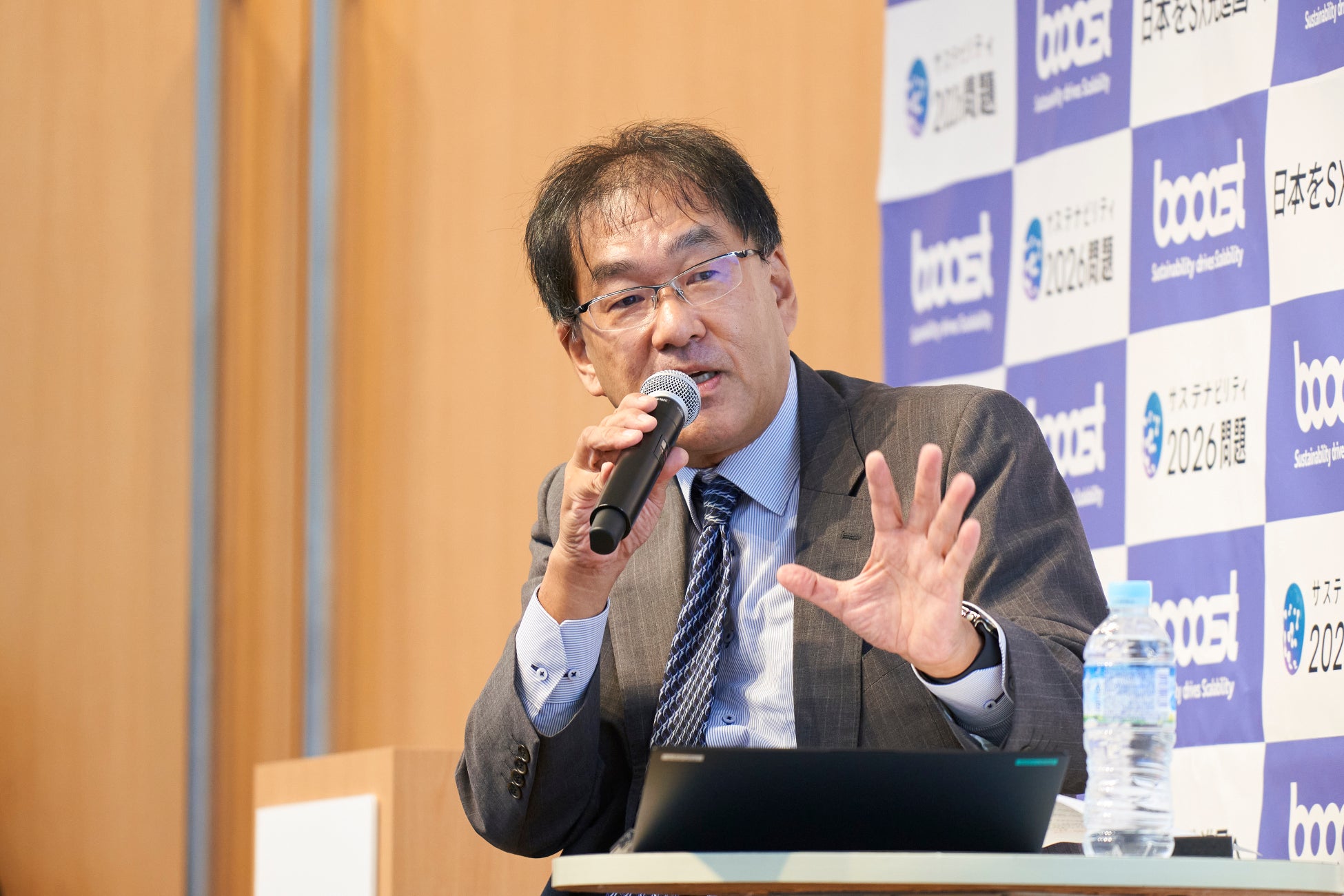 パネルディスカッションでは、アセットマネジメントOneの寺沢徹氏、ボストン コンサルティング グループの半谷陽一氏、Booost 取締役の大我猛が登壇し、「攻めのサステナビリティ経営」の実践と、それを支える投資・戦略のあり方について意見を交わしました。
