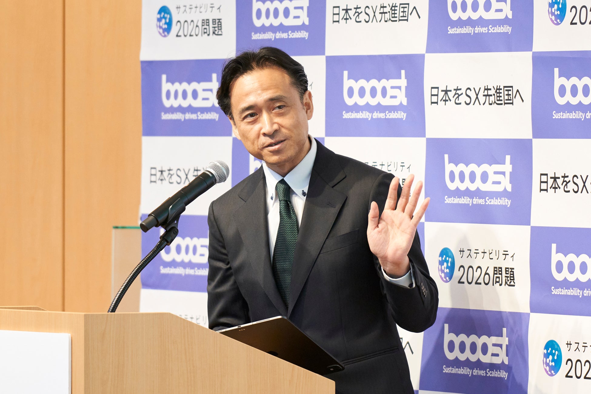 冒頭では、Booost 代表取締役 青井宏憲より、カンファレンスの趣旨説明が行われました。青井は、「サステナビリティは単なる制度対応ではなく、企業成長のエンジンとなるべき」と強調し、企業経営のパラダイムが「経営3.0」へと移行していることを提示しました。また、各企業の対応が分岐する「サステナビリティ2026問題」への警鐘と、それを乗り越えるための戦略的開示・経営基盤の整備の重要性を説きました。