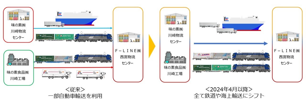 今回の取り組みでは、主力生産・物流拠点である味の素食品社川崎工場、当社川崎物流センター(ともに神奈川県)とF-LINE社西宮物流センター(兵庫県)を結ぶ主要区間の輸送において、当社が先行し進めていたモーダルシフト化を味の素食品社からの出荷にも展開し、鉄道と船舶の増便により2024年4月に完全モーダルシフト化を達成、味の素食品社は前年と比較しCO2排出量を約80%削減することができました。