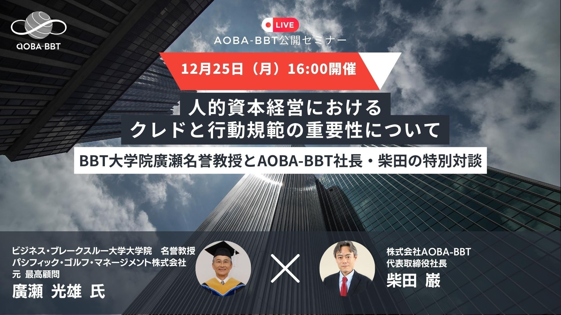 このセミナーでは、社名変更に伴う「第二の創業」としての新たなクレドと行動規範の整備について、BBT大学院の廣瀬名誉教授とAoba-BBT社長の柴田が対談いたします。組織運営の基盤を強化し、効果的な人的資本経営を目指す上で、貴重な学びの場となることでしょう。皆様のご参加を心よりお待ちしております。
