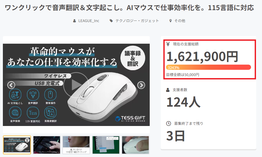 株式会社LEAGUE(リーグ)は、2022年4月にマクアケで支援金1000万円超えを達成した「TESS GIFT AI ライティングマウス」を、2024年1月13日(土)午前11時よりCAMPFIREの新規プロジェクトとして開始しました。
