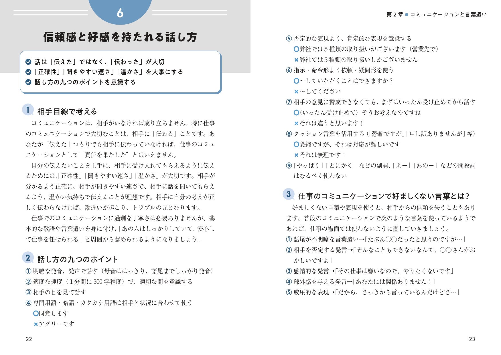 ビジネスパーソンが早い段階で必ず身に付けたいビジネスマナー、報告・連絡・相談などの仕事の基礎から、いまの時代に合わせたSNSやビジネスチャットの使い方、情報セキュリティやキャリアに関する基本まで網羅しています。基礎的なマナーだけでなく、信頼を生むコミュニケーションスキルや、仕事で成果をあげられるタイムマネジメントスキル、キャリアの考え方など、社内での活躍や社会人としての成長までを網羅した一冊です。