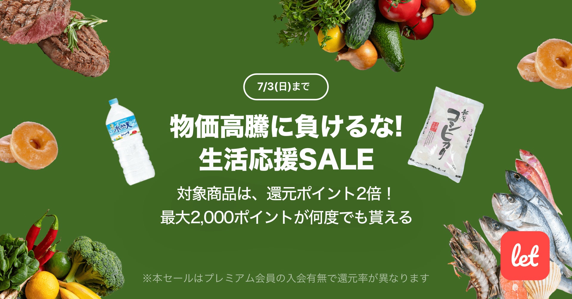 株式会社レット(本社:東京都港区、代表:佐藤 航陽)が運営する、食品ロス/在庫ロス削減のマーケット「Let(レット)」内で「物価高騰に負けるな!生活応援SALE」を7月1日(金) 18:00より開催します。期間中、プレミアム会員様限定で対象の食品をご購入いただくと、2,000ポイントを上限に還元ポイントが2倍になります。期間中のご購入であれば、ポイント還元はお一人様あたり何度でもご利用いただけます。