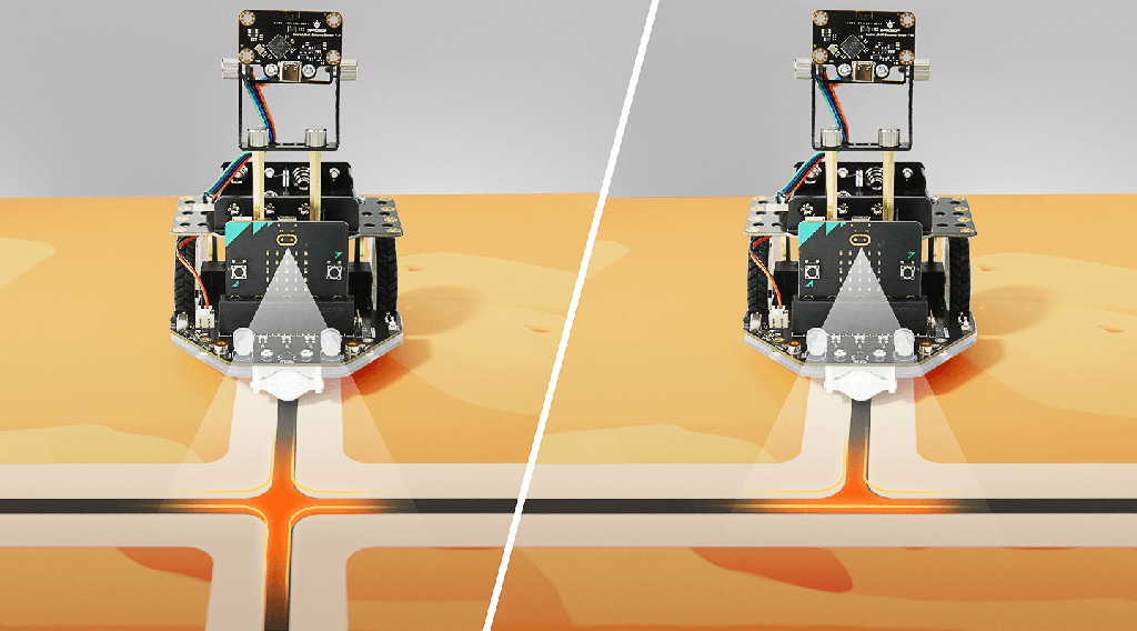 「Maqueen Plus」シリーズは、micro:bitを搭載して動作する教育向けロボットプラットフォームの上位モデルです。Maqueen Plus V2では、I2Cポートを3系統に拡張し、AIカメラHUSKYLENSなどのモジュール接続に対応。大型ボディと5点ライントレーサにより、走行安定性と検知精度が大幅に向上しています。さらに最新のV3では、モーターエンコーダによる走行距離・回転角の高精度制御と、マトリクスレーザー測距センサーによる周囲認識が可能。これにより、直進や旋回の安定性が大幅に向上し、交差点の判別や障害物回避といった複雑な経路制御が可能になりました。学校教育・ロボットコンテストでの活用を想定した設計で、安定性と拡張性を両立し、micro:bitを使ったロボット学習の基礎から応用への段階的な発展をサポートするモデルです。