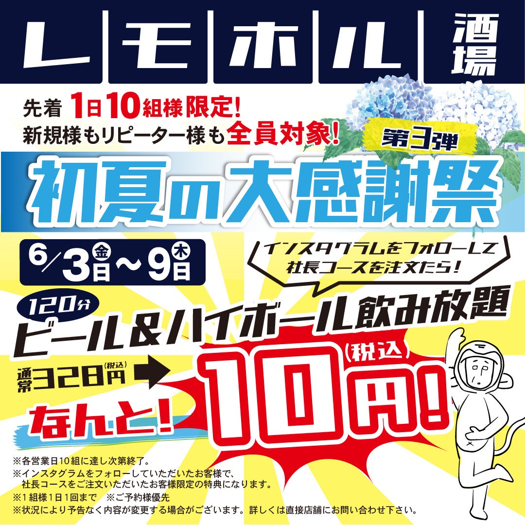 レモホル酒場で食べて飲んで暑い夏を乗り切ろう!6月3日(金)感謝祭スタート!お一人様もご新規様もリピーター様も全員が対象!