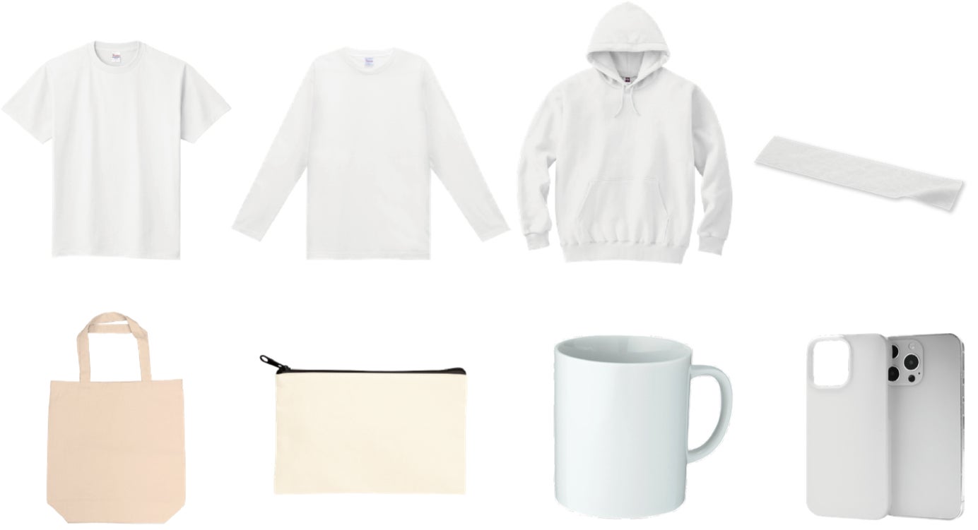オリジナルデザインを作成できるグッズは全10アイテム。ファッションから日常づかいできるアイテムまで幅広く取り揃えています。