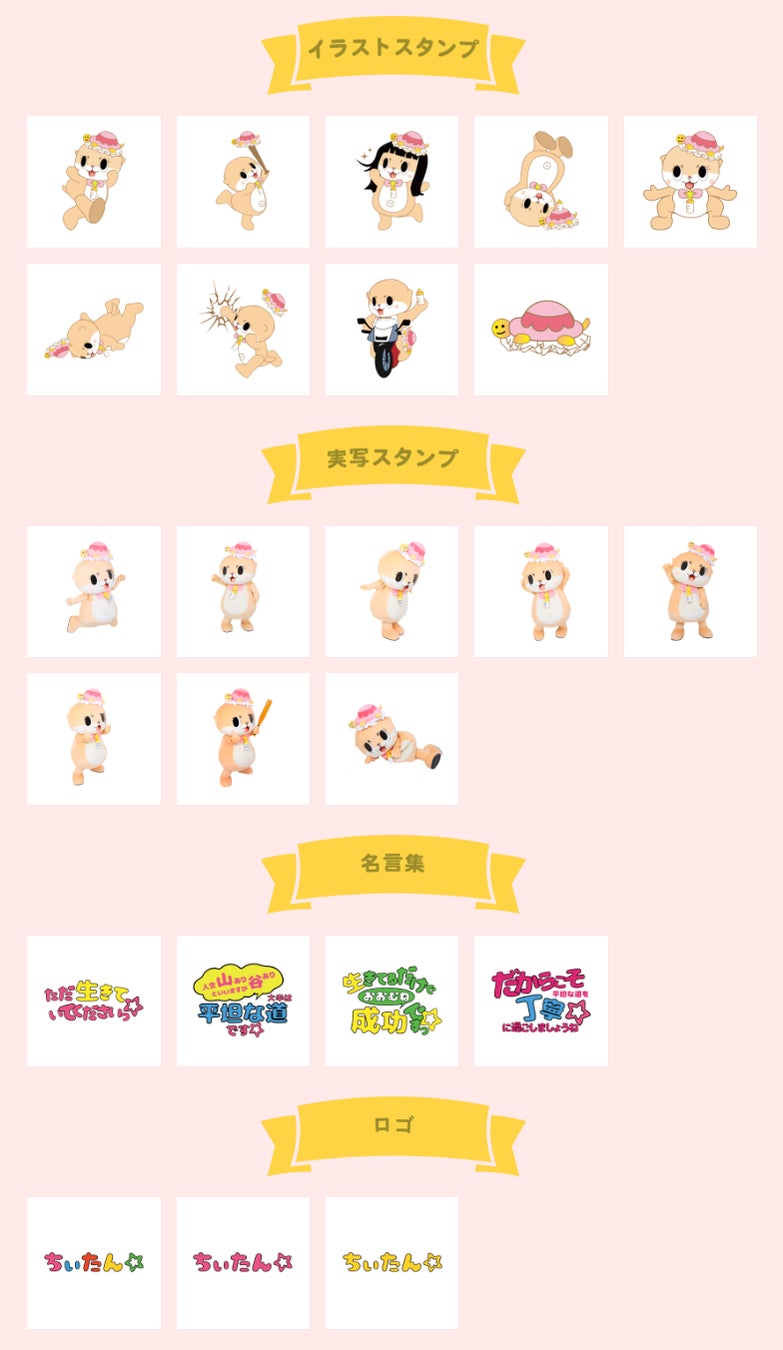 コラボレーション限定の描き下ろしイラスト、実写のちぃたん☆を始め、ロゴや過去の名言集などバラエティに富んだスタンプを用意しております。