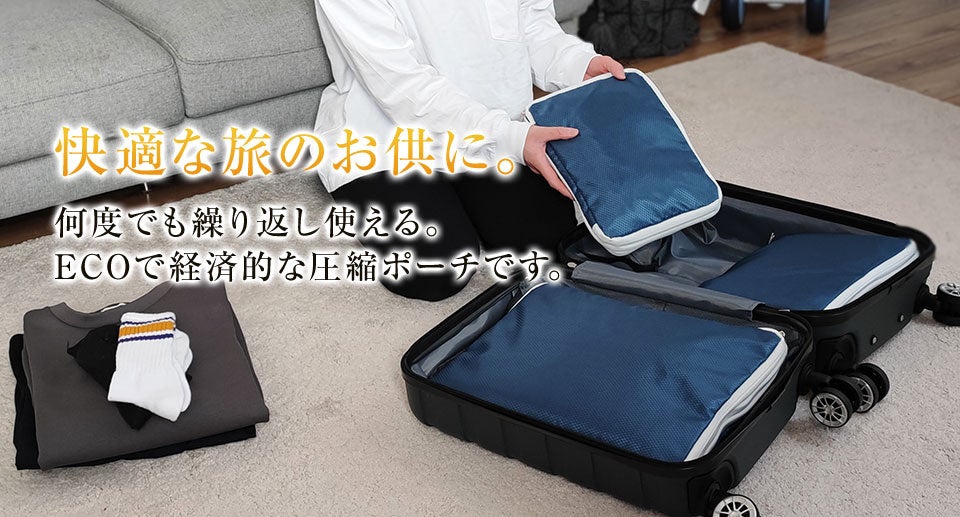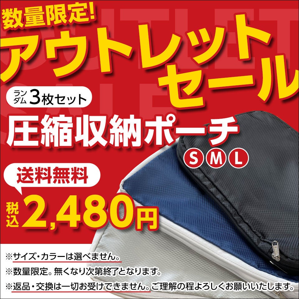 今回の特別セールでは、衣類をすっきりコンパクトにまとめられる大人気の圧縮収納ポーチを、特別に3点セットで税込2,480円(送料無料)の破格値でご提供します。