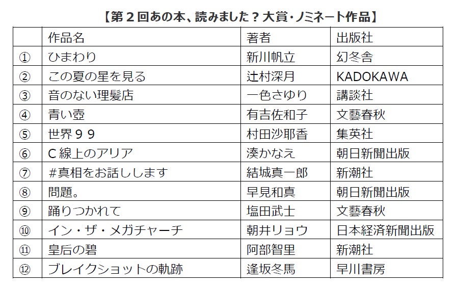 「本から見つけた名言賞」は、「手帳に書き留めておきたい、本からの名言」をテーマに「第2回 あの本、読みました?大賞」のノミネート12作品の中から選出されます。