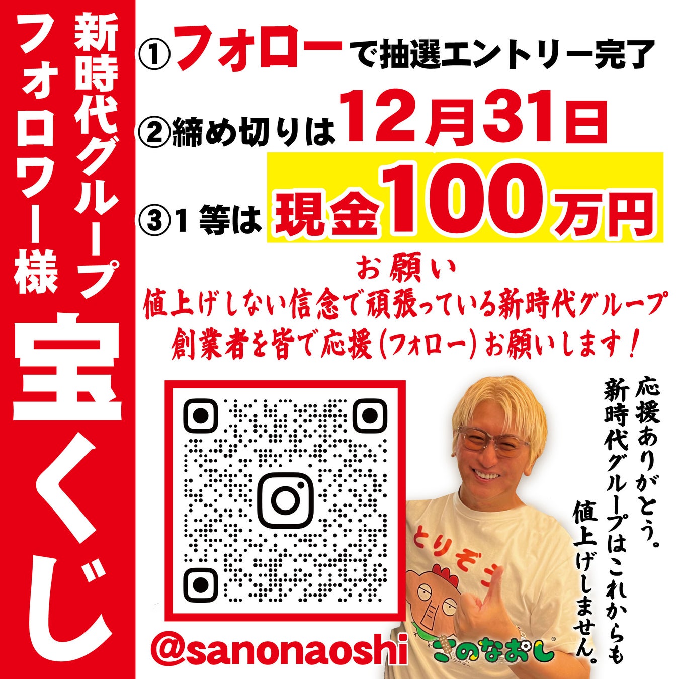「値上げしない」信念で頑張っている新時代グループ創業者さのなおしを応援(@sanonaoshiのInstagramフォロー)よろしくお願いします!