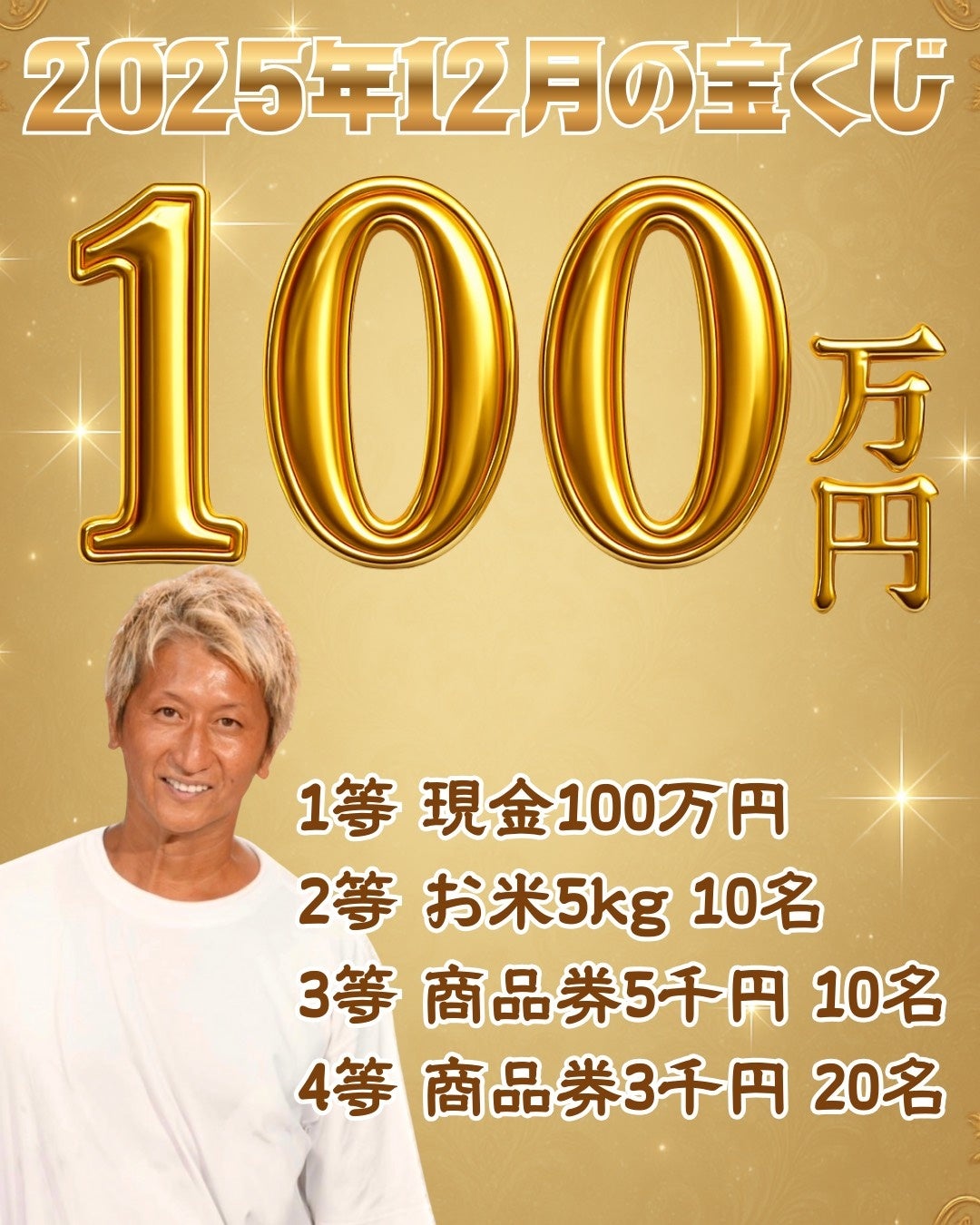 2025年12月新時代グループ創業者さのなおしが豪華ラインナップの宝くじを開催いたします。応募締め切りは2025年12月31日23:59。エントリー方法は新時代グループ創業者さのなおしのInstagram(@sanonaoshi)フォローするのみです。宝くじ詳細は新時代グループ創業者さのなおしの公式Instagramをご覧ください。