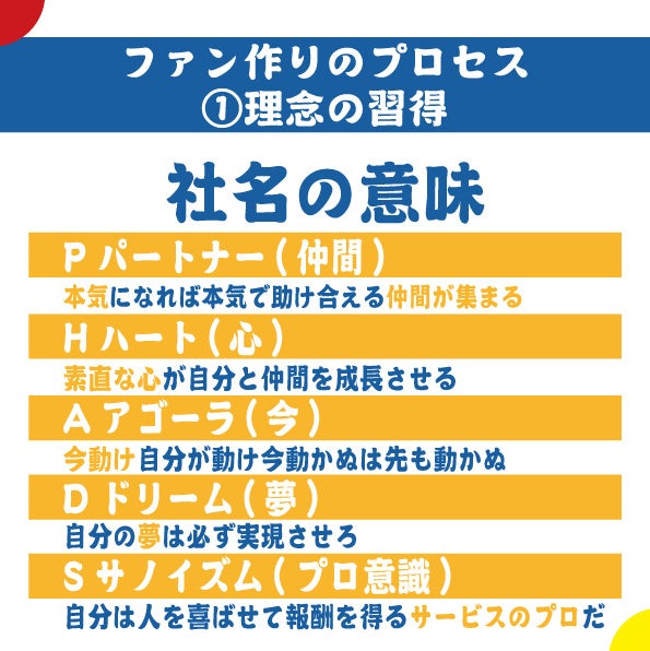 社名のPHAD‘Sは、Partner(仲間)、Heart(心)、Agora(今 [ポルトガル語])、Dream(夢)、サノイズム(プロ意識)の5つの頭文字から名付けられました。