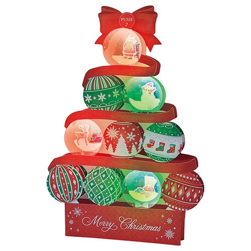 クリスマスカラーの赤、緑、白でデザインされたオーナメントをツリー状に積み重ねた、立てて飾れるカードです。ボタンを押すと「ひいらぎかざろう」の曲に合わせて、透明素材のオーナメントが光ります。暖炉とサンタ、教会と雪だるまなど、透明素材の中にクリスマスの小さな世界を表現しています。