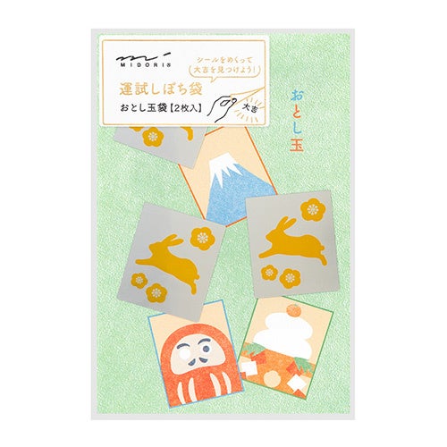 おみくじのように、シールをめくって運試しが楽しめるおとし玉袋です。カードのシールをめくると、対になった同じモチーフの絵柄があらわれます。