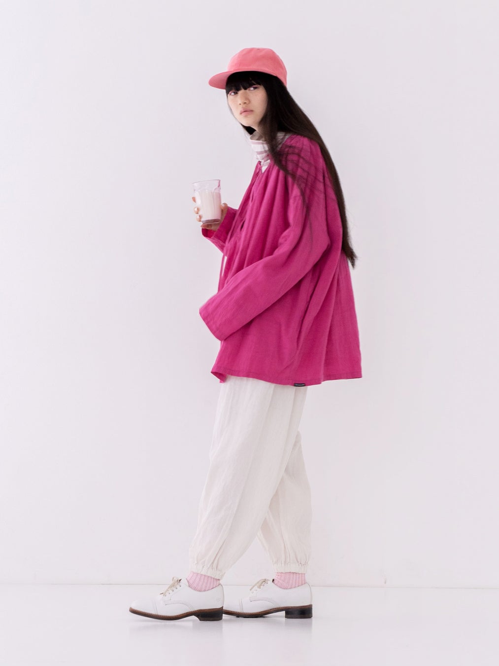 襟まわりに細やかなギャザーを贅沢にあしらったスモックブラウス。抜け感のあるスッキパーデザインに。深めの空きなので、INにロゴTeeなどを重ねた着こなしもおすすめです。袖口は筒袖にし、程良いカジュアル感をプラスしました。
