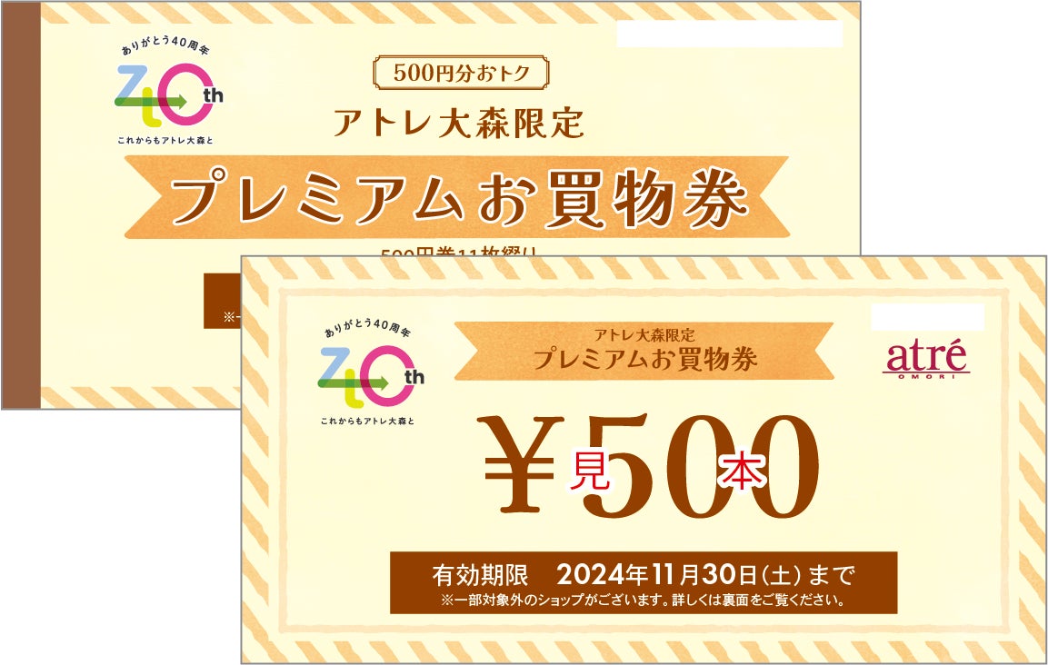 アトレ大森で利用できる5,500円分のお買物券を5,000円(税込)で販売します。