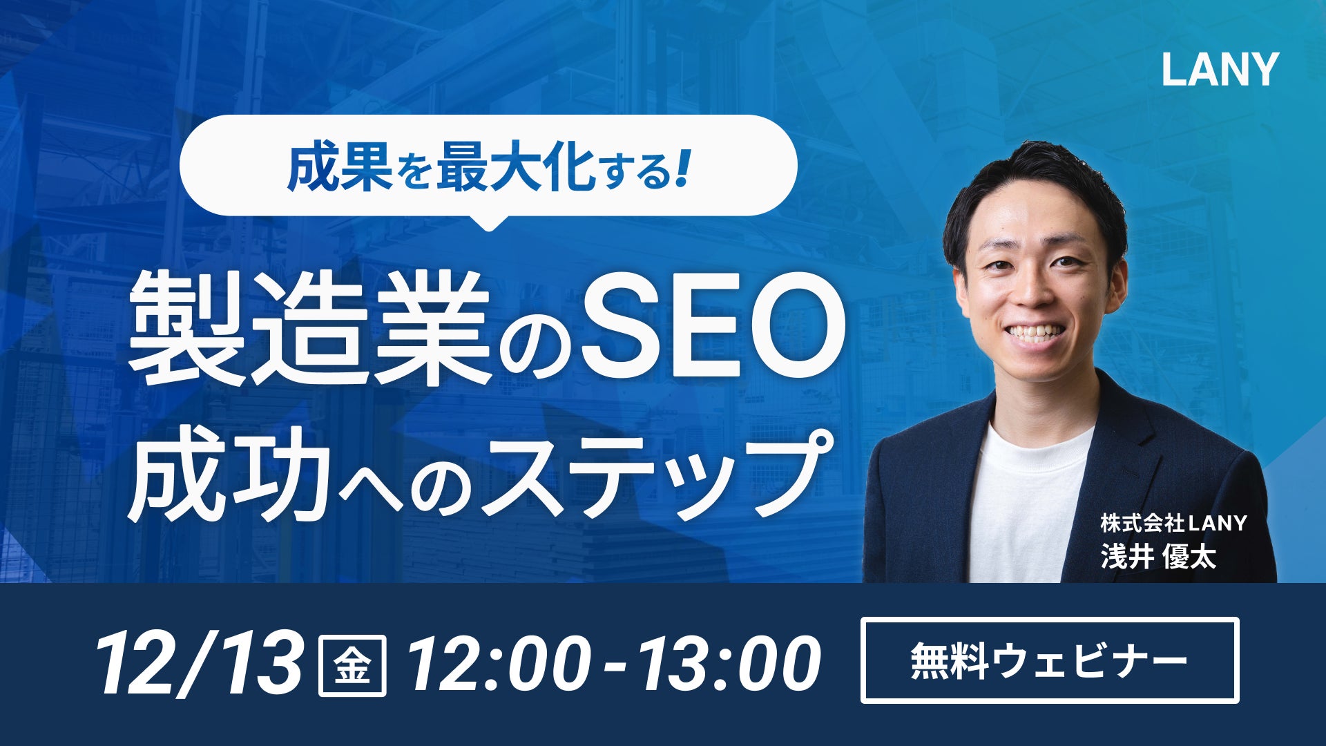 デジタルマーケティング支援を行う株式会社LANY(東京都渋谷区、代表取締役社長:竹内渓太)は、【無料ウェビナー】成果を最大化する!製造業のSEO成功へのステップを12/13(金)に開催いたします。