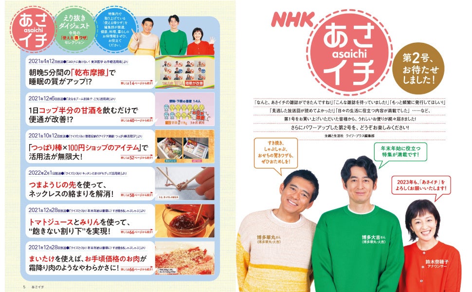 「なんと、あさイチの雑誌ができたんですね!」「こんな雑誌を待っていました!」「見逃した放送回が読めてよかった!」「日々の生活に役立つ内容が満載でした」……など、第1号をお買い上げいただいた皆様から、うれしいお便りが続々届きました。さらにパワーアップした第2号をお届けします。