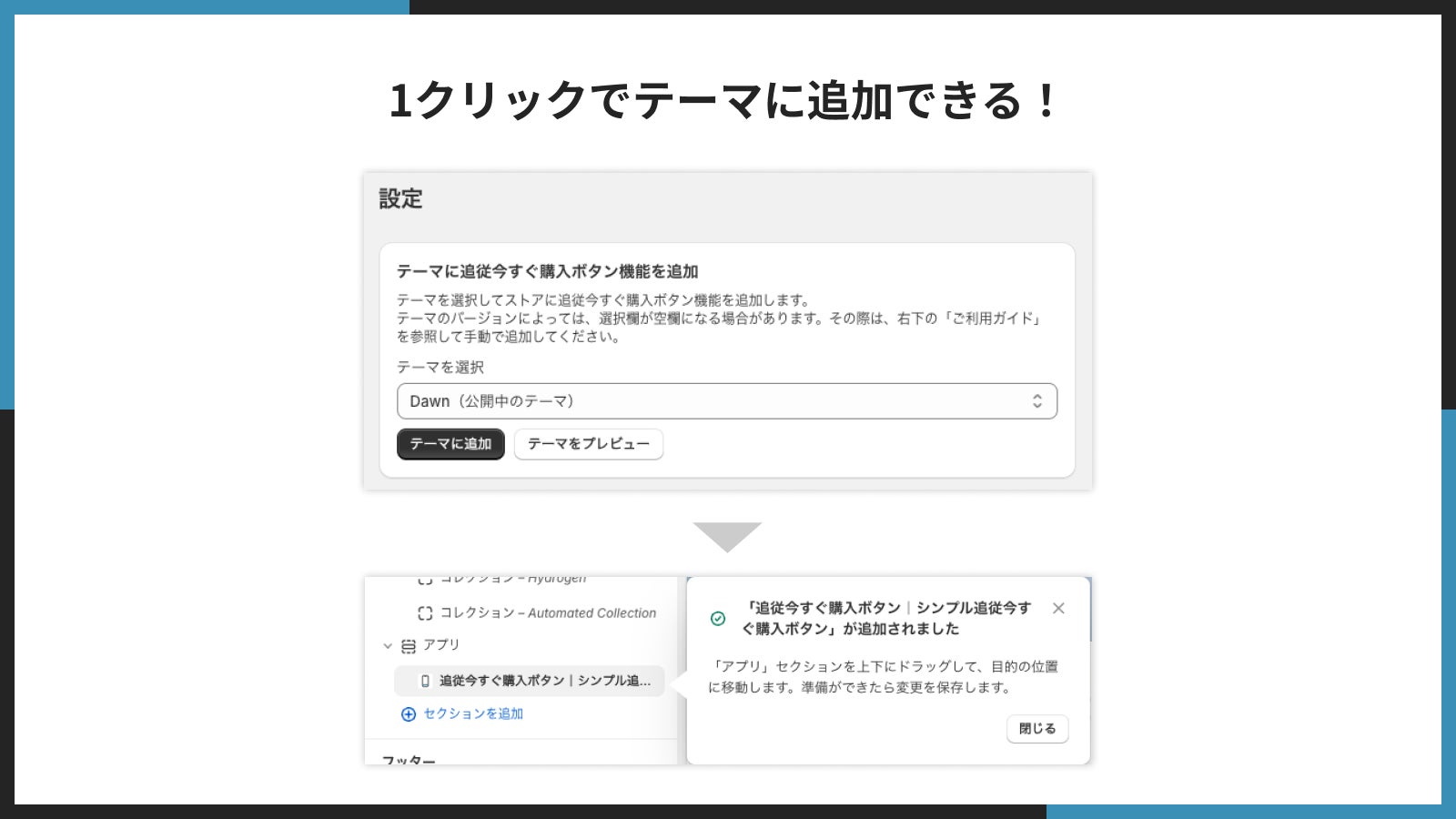 面倒な設定や複雑なコード編集は一切不要です。ワンクリックでお使いのShopifyテーマに追従型今すぐ購入ボタンを追加できます。インストールから実装まで、わずか数分で完了するため、すぐに効果を実感できます。また、テーマを変更した場合でも、再度ワンクリックで新しいテーマに適用できるため、テーマの切り替えを心配する必要もありません。