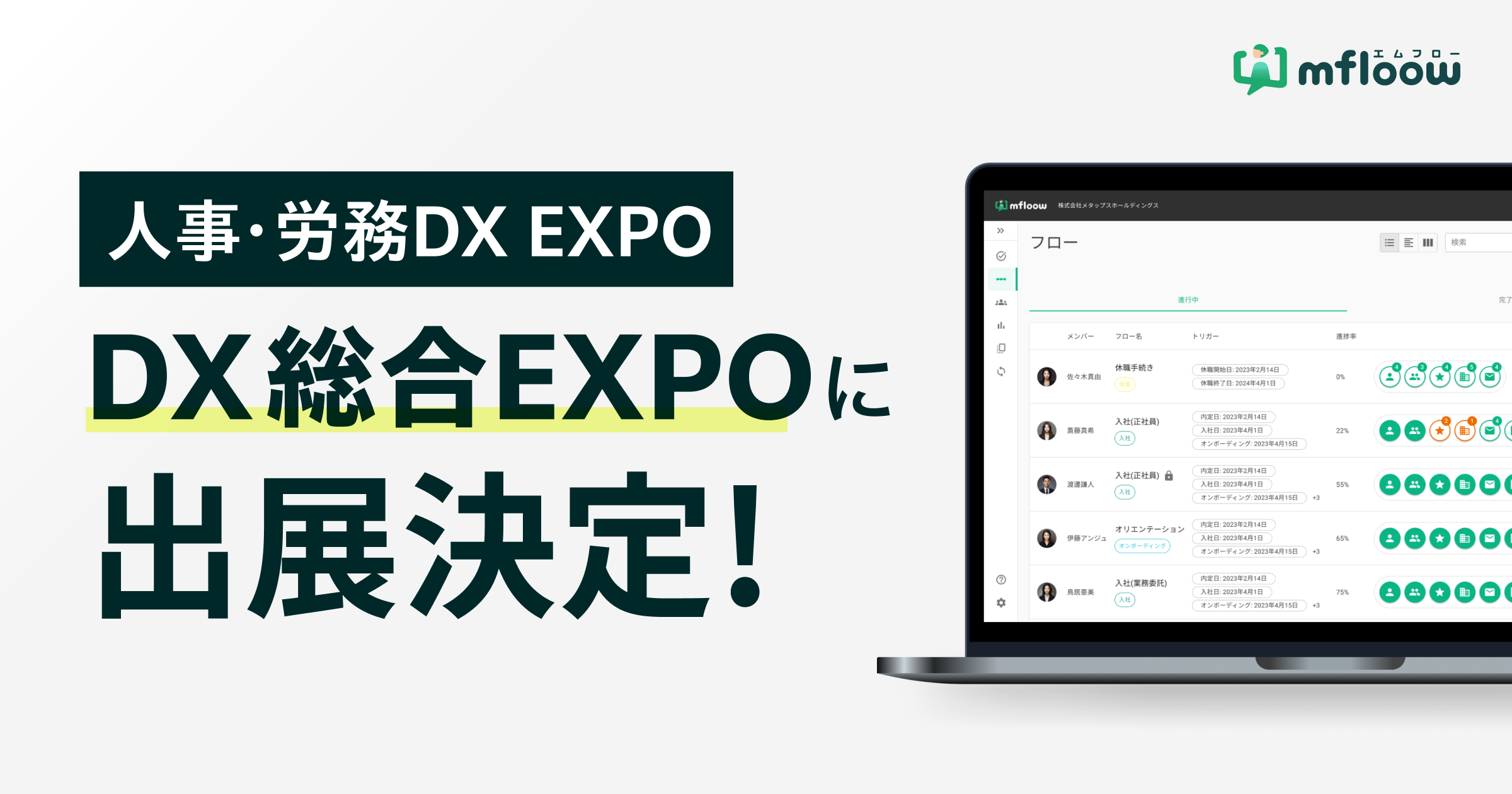 株式会社メタップスホールディングス(渋谷区、代表取締役社長 山﨑 祐一郎)が提供する従業員ライフサイクル管理ツール「mfloow(エムフロー)」は、2025年5月21日(水)〜23日(金)にインテックス大阪で開催される「DX 総合EXPO 2025 春 大阪」内「人事・労務DX EXPO」に出展します。人事・労務の課題解決に向けて「mfloow」による業務のデジタル化を提案します。また、事前にブース訪問予約をして来場下さった方にAmazonギフトカード(1,500円分)をプレゼントするキャンペーンも実施します。