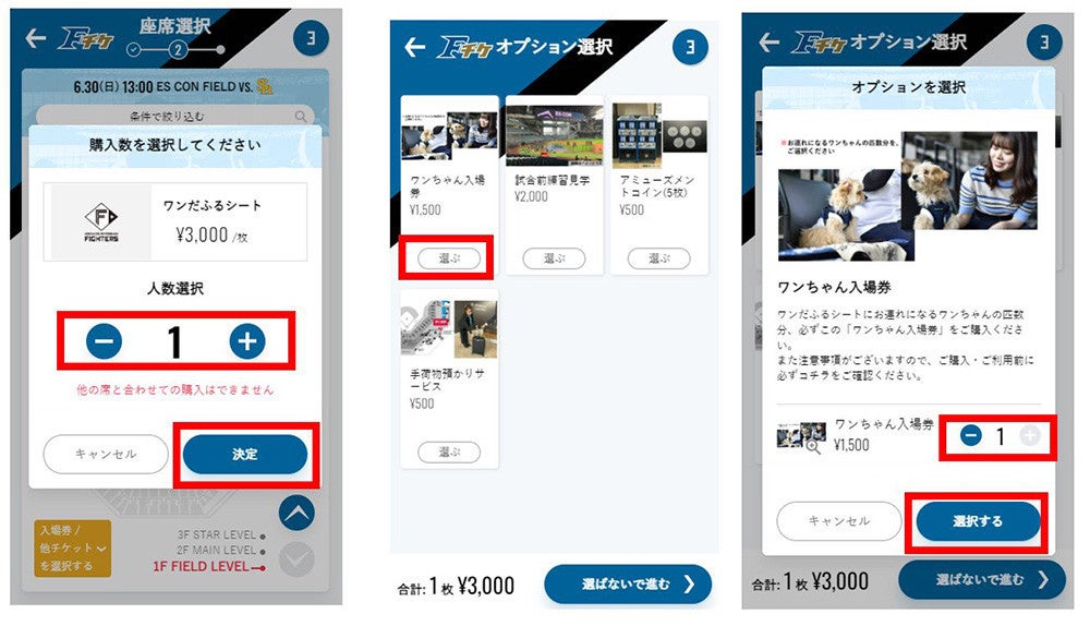 例)飼い主3名と愛犬2匹で「ワンだふるシート×3枚+ワンちゃん用入場券×2枚」を購入する場合
