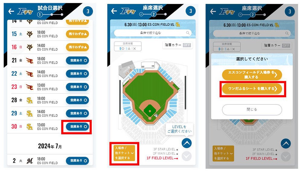 ②球場図左下の「入場券/他チケット」を選択し「ワンだふるシート」を選択