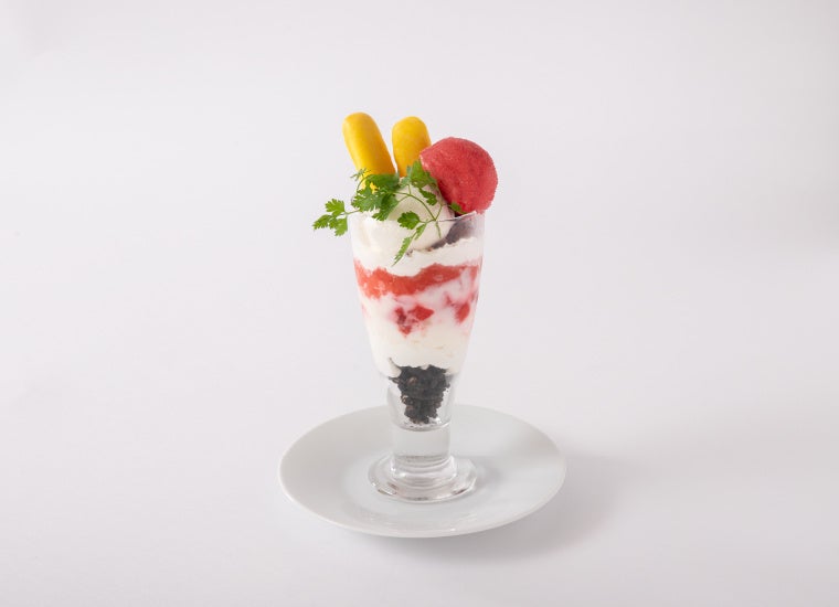 チョコクランチやミルクプリンの入ったパフェに、ヨーグルトアイスとフランボワーズシャーベットをトッピング!