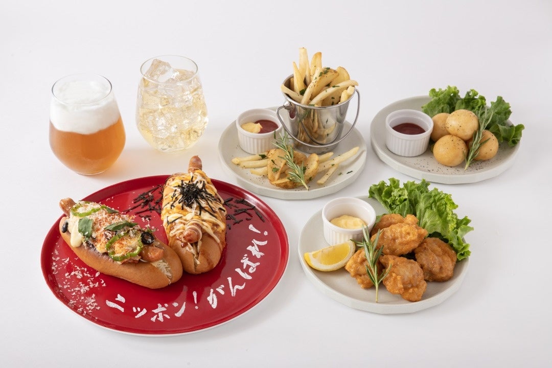 メニューは、バレーボールの技術やテクニックをイメージし、具材の組み合わせを工夫したボリューム満点のホットドック、お好きなホットドッグを2つ選択できるダブルドッグで応援の準備万端“ニッポン!がんばれ!”のプレート、おつまみにもピッタリな、みんな大好き!フライドポテト、チーズボール、唐揚げなどの軽食メニューのほか、デザートやドリンクなどバレーボールにちなんだ目で見るだけでも楽しめる工夫を凝らした、ここでしか楽しめないメニューが登場します。ビール、レモンサワー、ハイボールなどのアルコール類もご用意いたします。