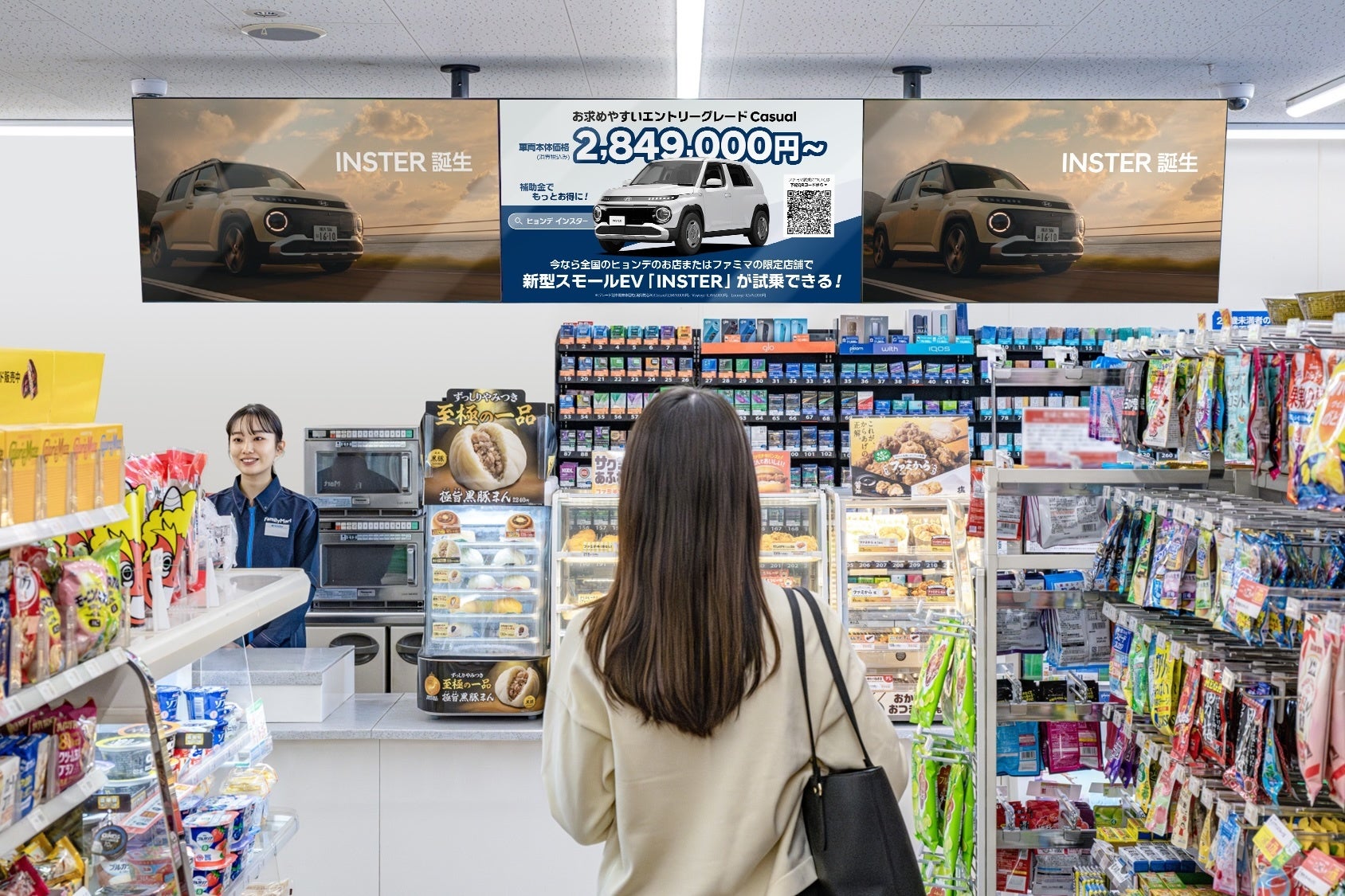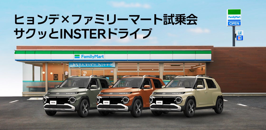 協業第一弾として、今春販売を開始する新型スモールEV「INSTER(インスター)」が試乗できる「ヒョンデ×ファミリーマート試乗会 サクッとINSTERドライブ」を、4月4日(金)から5月4日(日)までの期間、関東近郊のファミリーマート10店舗で順次開催します。また、4月8日(火)から5月5日(月)までの期間に、ファミリーマート店内に設置されているリテールメディア「FamilyMartVision」および店内放送でヒョンデのCMを配信します。