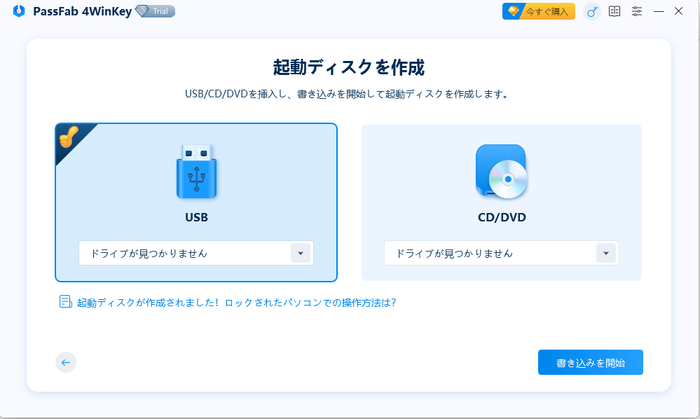Step1:PassFab 4WinKeyを起動し、USBなどのメディアをパソコンに挿入します。利用するメディアを選択し、「次へ」をクリックします。