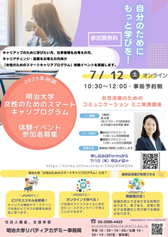明治大学の生涯学習機関「明治大学リバティアカデミー」は2025年度から「女性のためのスマートキャリアプログラム」をリニューアルしました。