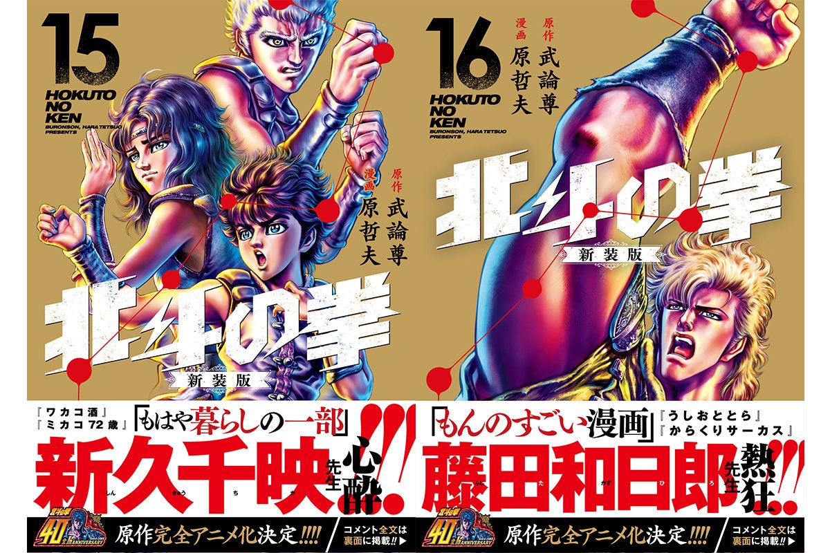 新作アニメ化も決定、累計1億部突破の『北斗の拳』が装い新たに単行本化。生誕40周年を迎えた『北斗の拳』 新装版の第15巻・第16巻が3月19日に同時発売。