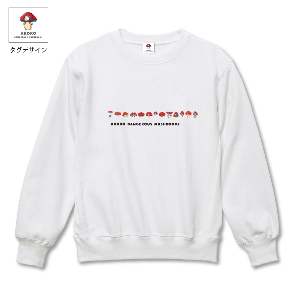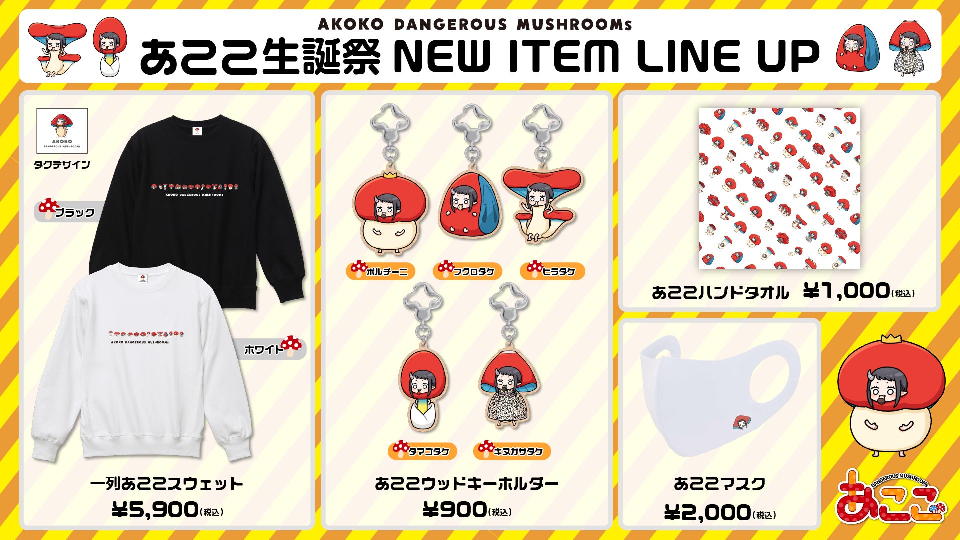 「あここ」がデザインされたスウェットやウッドキーホルダー、ハンドタオルなど、ファン必見のきのこ尽くしアイテムが勢ぞろい!