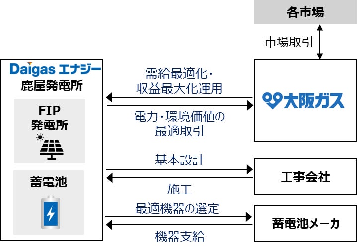 本事業では、Daigasエナジーが蓄電池の選定、基本設計、電力会社との連系協議などを進め、本発電所(発電容量約2MW)の敷地内に、定格出力約2MW、定格容量約6MWhの蓄電池を設置します。運用開始後は大阪ガスが蓄電池の遠隔制御を行います。また、本発電所はFIT制度※1からFIP制度※2への移行を予定しており、本発電所および本蓄電池を活用して発電・放電された電力の全量を大阪ガスが買い取る計画です。さらに、本蓄電池を活用した需給調整市場への参入により、電力系統の安定化へのさらなる貢献と収益の拡大を目指します。