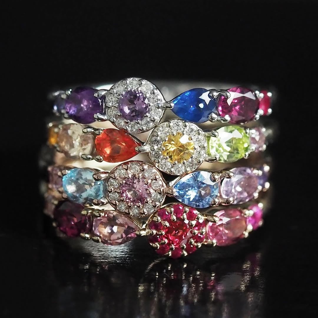 2本、3本と重ねることで、繊細なパヴェのような印象に。色を重ねれば、表情が変わり、手元にリズムと個性を生み出します。重ねる順番やカラーの組み合わせによって雰囲気が自在に変化し、自分らしいスタイルを描くことができるレイヤードリングです。