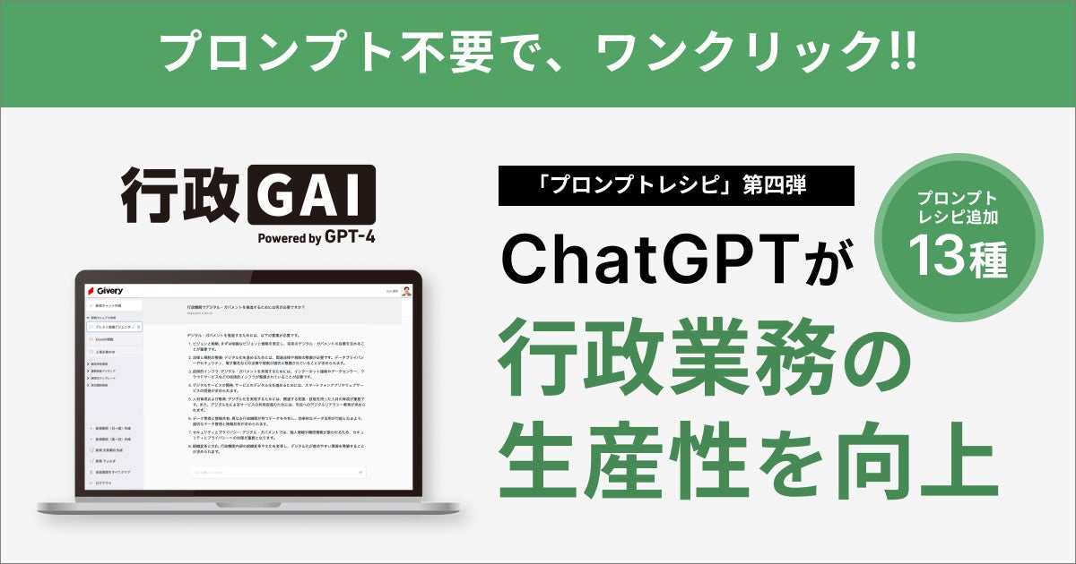 加えて、ITに関する詳しい知識がなくてもChatGPT機能を業務に即時活用できるよう、ワンクリックで行政機関向けのプロンプトを呼び出せる「プロンプトレシピ」を多数搭載しています。プロンプトに対するストレスを軽減し、作業効率を増進することで、行政職員の業務時間圧縮を実現するサービスです。