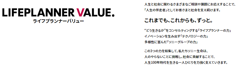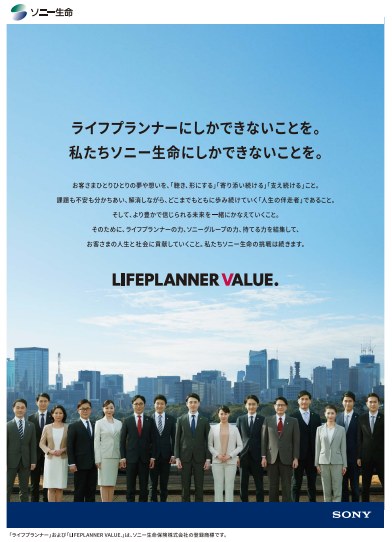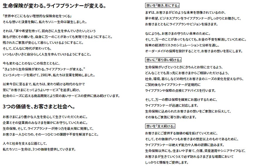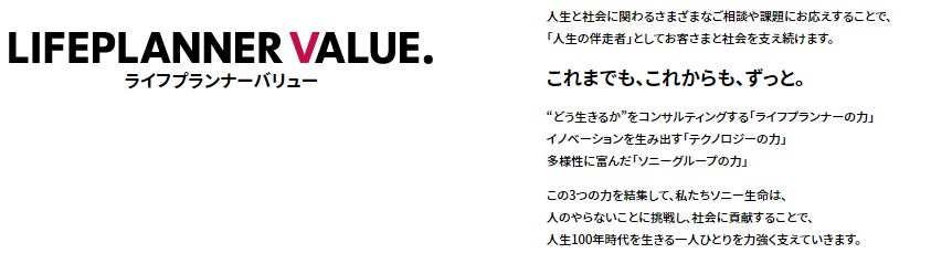 この3つの価値と定義し、これらを追求・提供していくことで、生命保険、そしてライフプランナーが持つ力を最大限に発揮し、加えてソニーグループの一員としてテクノロジーの力も大いに活用し、お客さま一人ひとりの課題や不安を解消するという当社の姿勢を、「ライフプランナーにしかできないことを。私たちソニー生命にしかできないことを。」というメインコピーとともに表現しています。