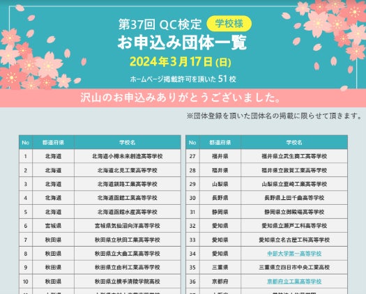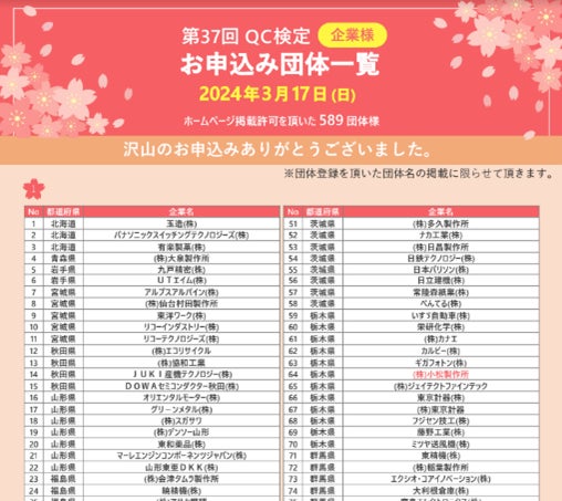 どのような組織がQC検定に取り組んでいるのかをご紹介いたします。下記URLに、前回検定(第37回QC検定:2023年3月17日実施)を団体申込で受検された企業・団体・学校のうち、名称公表の承諾をいただいた組織の一覧を掲載しています。ぜひご覧ください。