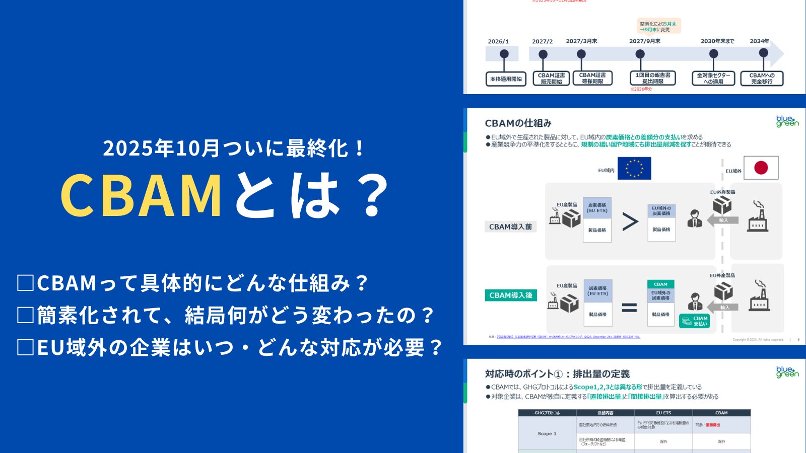 株式会社エスプールブルードットグリーン(本社:東京都千代田区、取締役社長:八林公平、以下「当社」)は、企業のサステナビリティ担当者向けに、EUのCBAM(炭素国境調整措置)制度の基本から最新動向までを分かりやすくまとめたお役立ち資料「CBAMとは?」を無料公開しました。