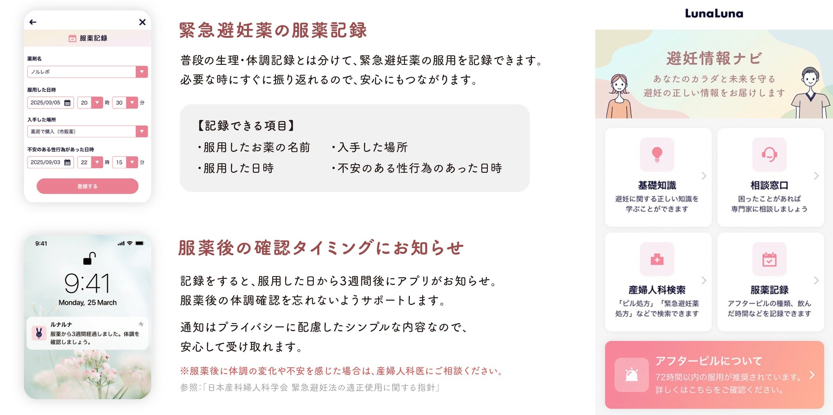ルナルナアプリ内では、緊急避妊薬の服薬記録を行う機能や、服薬日から3週間後にアプリから体調確認のタイミングをお知らせする機能を提供予定です。また、避妊に関する正しい知識について、産婦人科医監修の情報ポータル「避妊情報ナビ」を公開し、プライバシーに配慮した設計のもとで、利用者に寄り添った情報提供が行われます。なお、ルナルナに関するお問い合わせは、公式ブランドサイトをご確認ください。