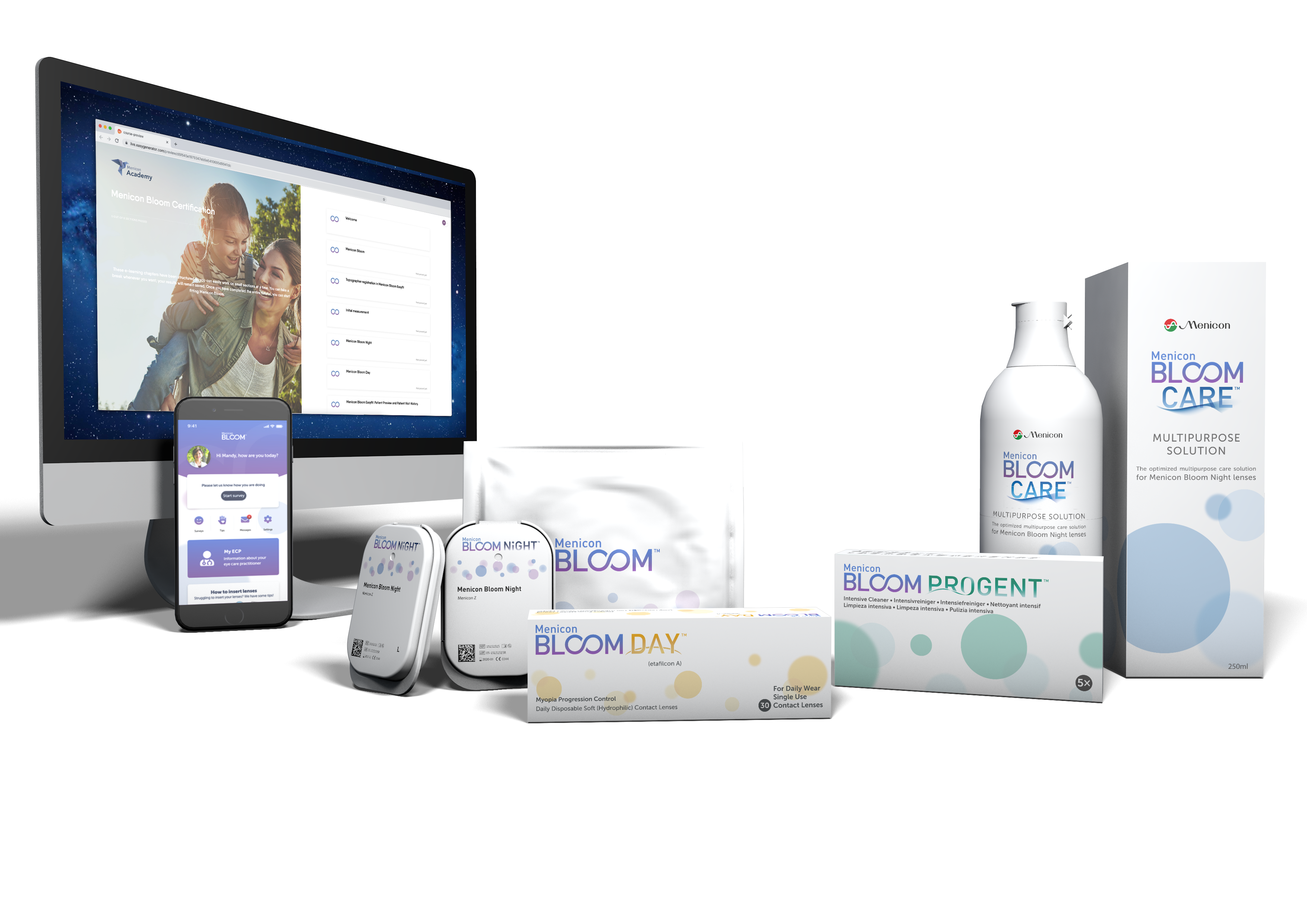 Menicon Bloom™は、近視進行抑制治療に取り組む処方家及び患者様をサポートするための総合的な近視進行抑制システムです。近視進行抑制用コンタクトレンズとしてCEマーク認証(※2)を取得したMenicon Bloom Night™(オルソケラトロジーレンズ)とMenicon Bloom Day™(1日使い捨てソフトコンタクトレンズ)に加え、ユーザビリティを向上させたMenicon Bloom™レンズケア、最先端のフィッティングソフトウェア、患者様とのコミュニケーション等に活用できるMenicon Bloom™アプリを提供いたします。
