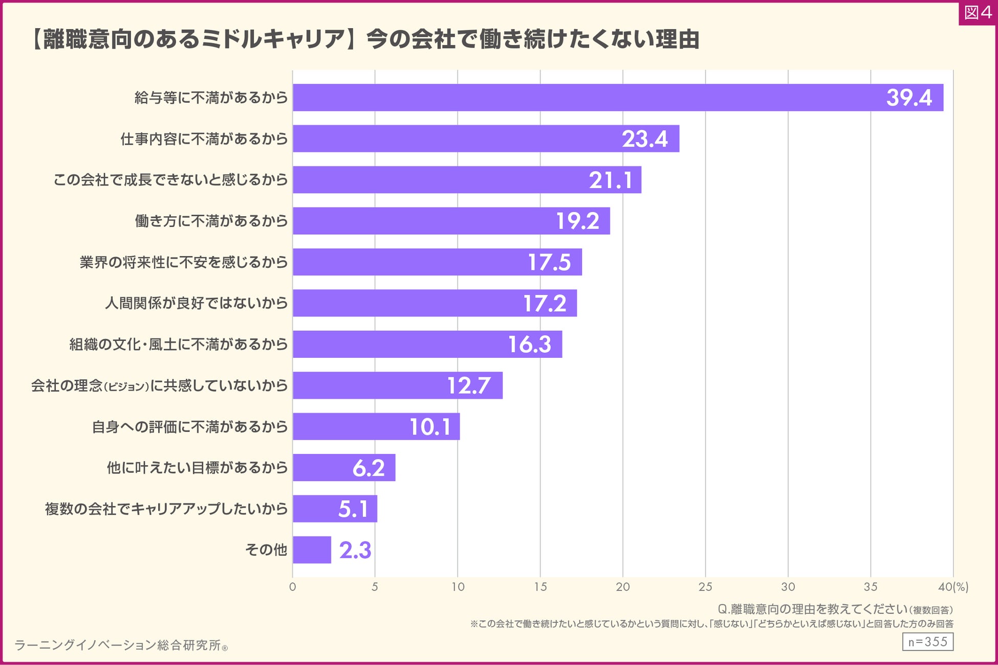4.今の会社で働き続けたくない理由、「給与等への不満」がトップに。次に「仕事内容への不満」「この会社で成長できない」が続く