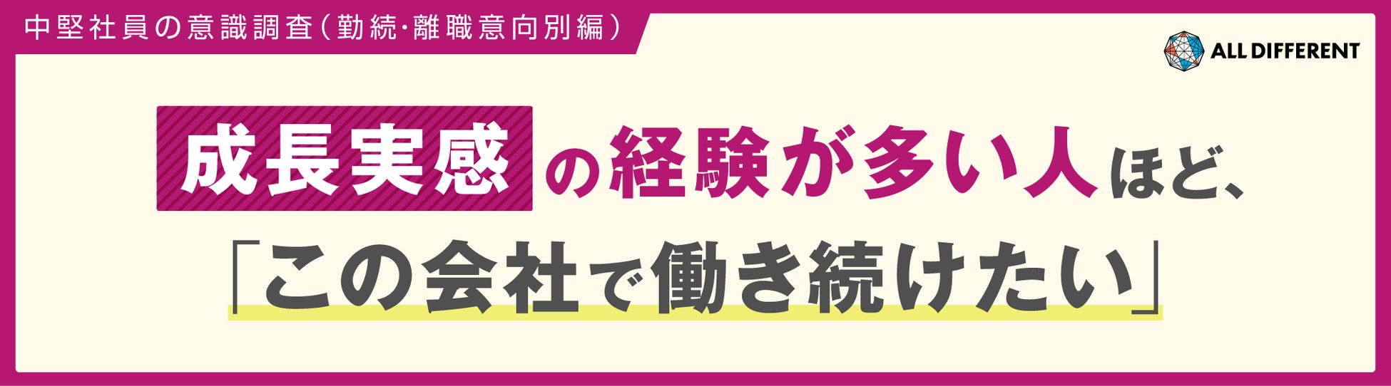累計13,000社420万人以上の組織開発・人材育成を支援するALL DIFFERENT(オールディファレント)株式会社(所在地:東京都千代田区 代表取締役社長:眞﨑大輔)および「人と組織の未来創り🄬」に関する調査・研究を行うラーニングイノベーション総合研究所🄬は、2024年12月に社会人5年目以上の役職がついていない中堅社員*800人に対し意識調査を行いました。本リリースでは、中堅社員の「勤続・離職意向」に関する調査・分析した結果を公表いたします。