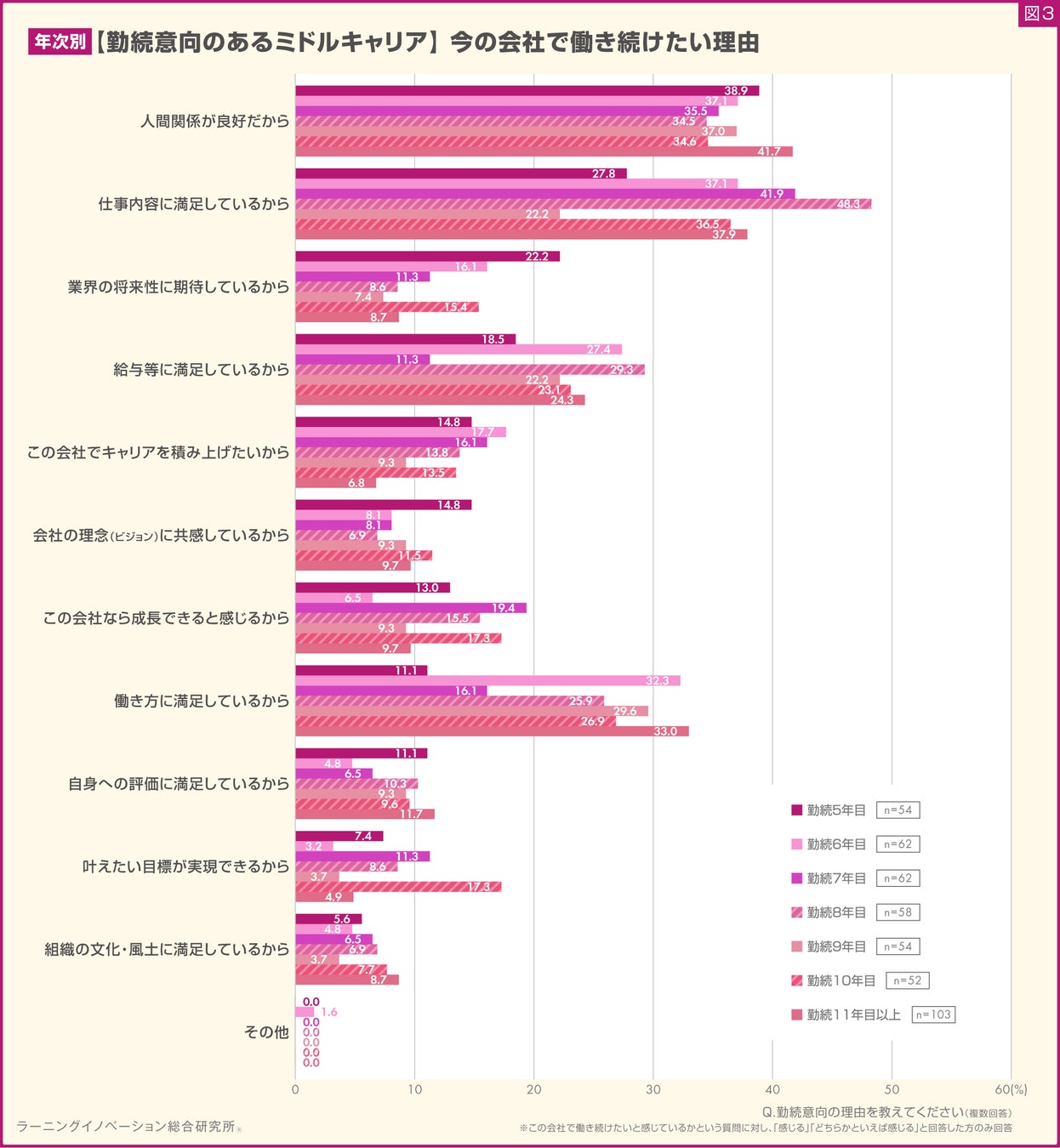 社会人8年目以降になると、「働き方に満足しているから」が高まる傾向にあり、社会人11年目以降が最大の結果となりました。(図3)