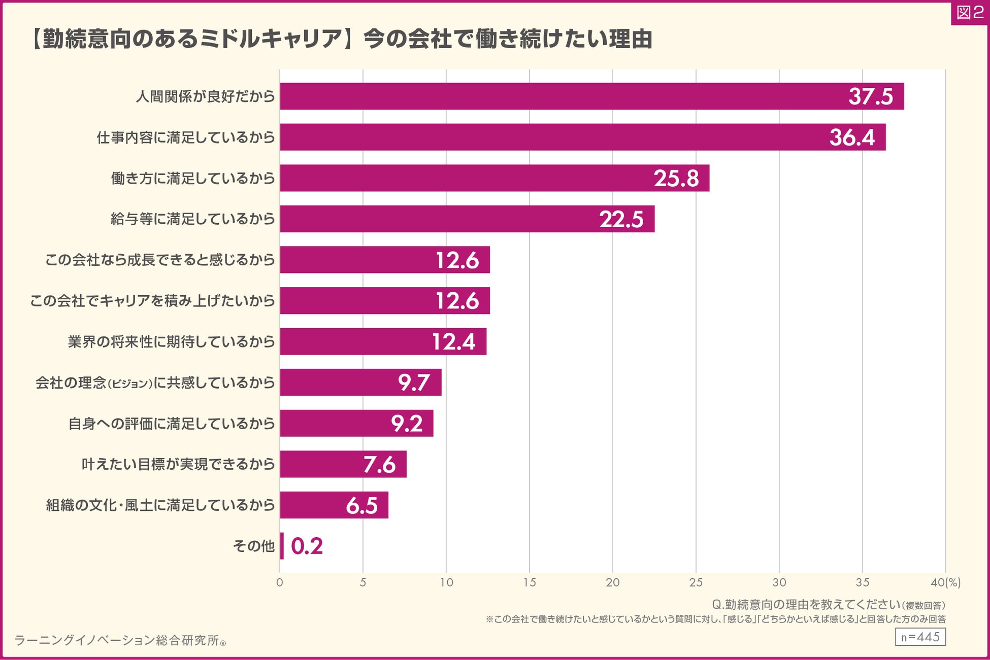 一方、回答割合が低かった項目は、「組織の文化・風土に満足しているから」(6.5%)や「叶えたい目標が実現できるから」(7.6%)でした。(図2)