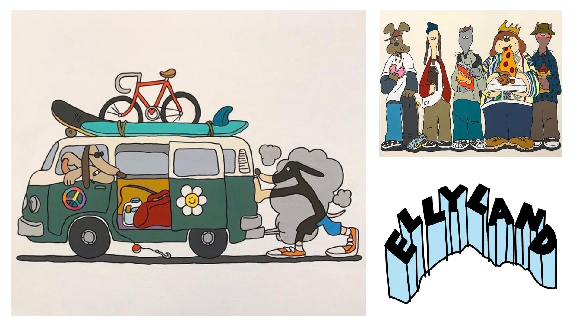 8月6日(土)、7日(日)には本人が在廊してのワークショップも開催いたします。参加者の名前をELLYLAND氏特有のタッチで描いたものや、作品に登場する犬に扮した似顔絵をその場で描き、データでお渡しいたします。今回のイベントでしか手に入らない1点物の原画の他、キーホルダーやTシャツなどのオリジナルグッズの販売も予定しております。