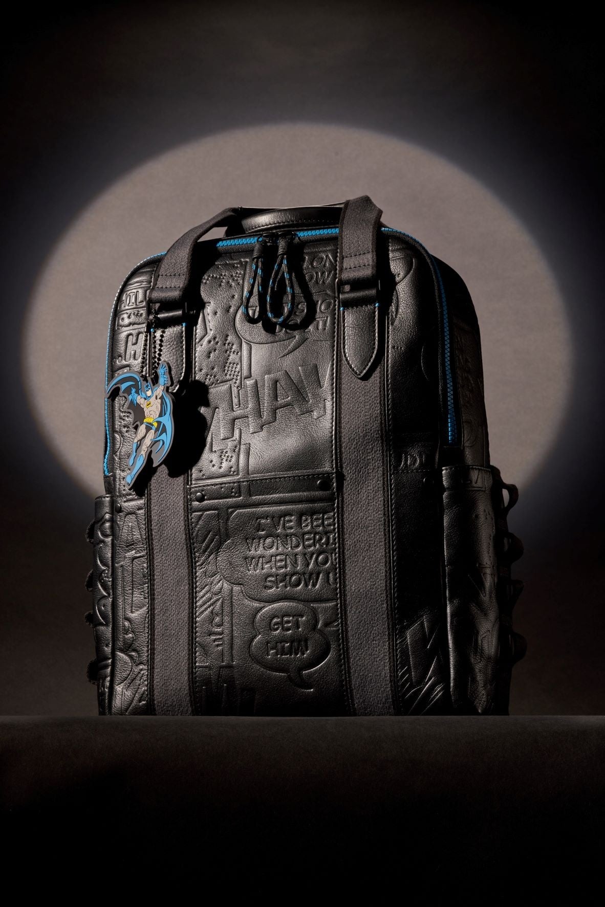 バットマン レザーグッズは、バックパック、財布、キーチェーン、ピンセットの限定品です。バックパックは、ヴィンテージコミック柄のエンボスレザーにバットマンブルーのストライプのウェビングと引き手のディテールが特徴です。二つ折り財布は、エンボスレザーにバットマンのグラフィックをシリコンではめ込んでいます。さらに、シリコン製のキャラクターキーホルダーやラペルピンのボックスセット(3つのグラフィックピンがセットになっています)で、バックパックをカスタマイズすることができます。
