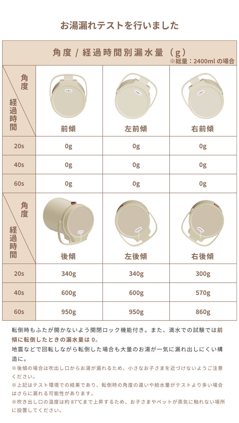 加えて、地震などで万が一倒れてしまっても一気にお湯が漏れ出にくい設計に。