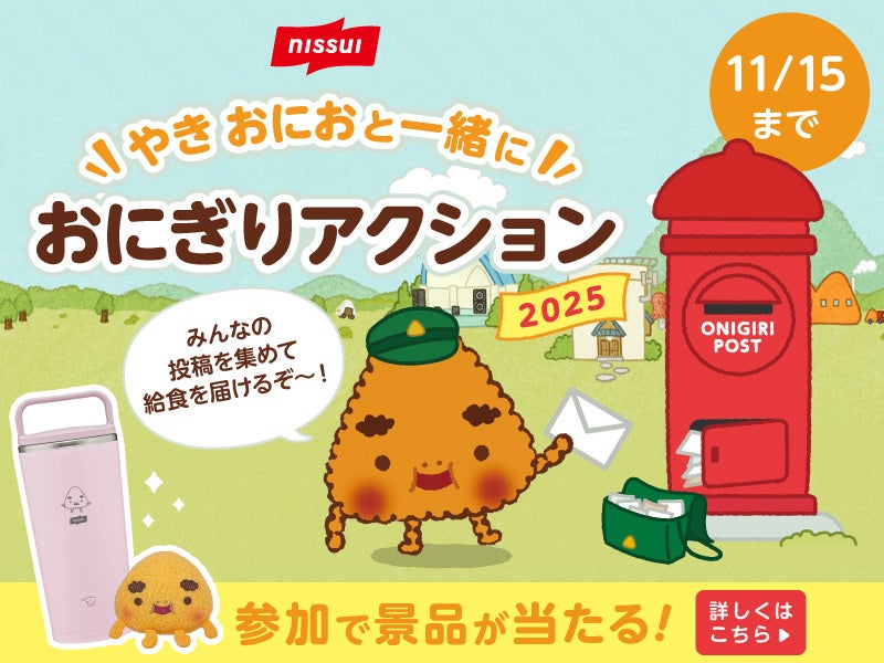 内容:SNSで投稿企画を実施します。焼きおにぎりのキャラクター「やき おにお」とその家族が、ニッスイとおにぎりアクションのクイズを出題し、キャンペーンを盛り上げます。専用サイトでは、世界に給食を届ける旅に出るおにおくんが、その想いを動画で伝えます。期間中は、店頭でのおにぎりアクションロゴ入り「大きな大きな焼きおにぎり」販売に加え、グループ社員への投稿を呼びかけ、おにぎりアクションをサポートします。