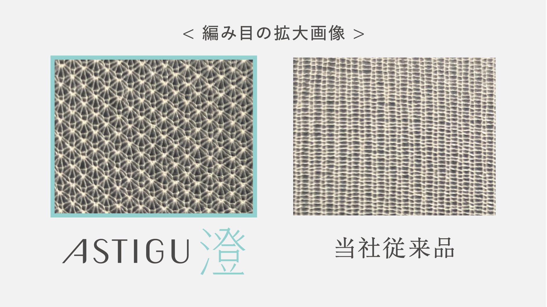 アスティーグ【澄】は、パンティ部とレッグ部に少し編み目が大きいメッシュ編みを採用し、風通しの良さにこだわりました。JIS L 1096 A法で実施した通気性試験では、自社基準値100㎤/(㎠・s) に対しレッグ部で約5倍の通気性があることが確認されました。